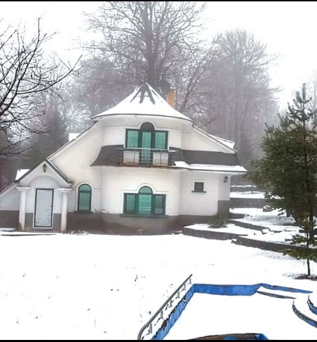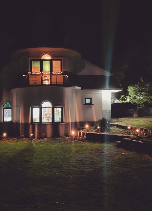 Going up the concrete staircase to the first floor, you are greeted by a two-story open gallery overlooking the living room and, through a semicircular roof window, a view of the beautiful western side of the mountain. There is also a circular bedroom with a double bed and two additional beds – armchairs. Accommodation is provided for 2 to 4 guests.