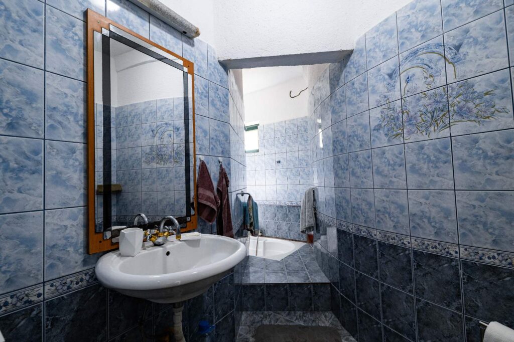 The bathroom is functionally divided into two parts: a primary part with a sink with a wall mirror and a toilet, and an intimate part with a built-in bathtub in the floor and an electric hot water heater. In addition to this toilet, the villa also has a separate toilet that is functionally connected to the living room and the back yard.