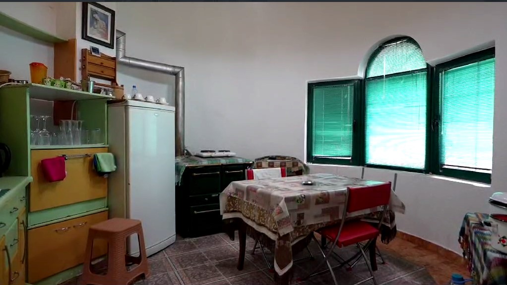 A circular room of 14m2 equipped with a work table for food preparation, a sink, hanging cabinets, a refrigerator, a wood stove for additional heating in winter and food preparation in the traditional way – on a stove and oven, a table with 4 chairs, a grill and other kitchen appliances. View of the yard with a swimming pool.